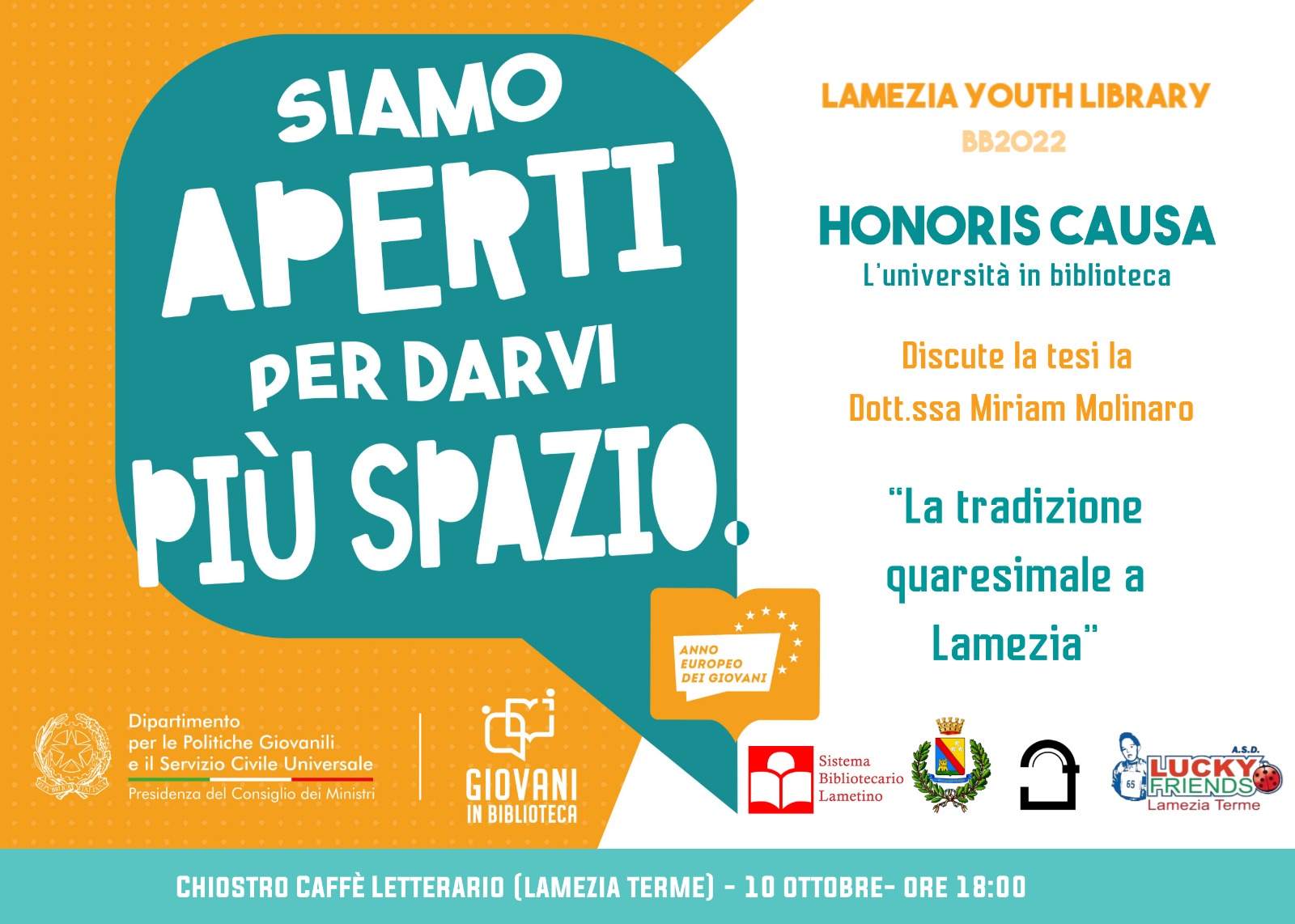Ospite dell'incontro è Miriam Molinaro, neolaureata in Scienze Turistiche presso l'Università della Calabria (UNICAL - Cosenza), che esporrà la sua ricerca intitolata: "La tradizione quaresimale a Lamezia".