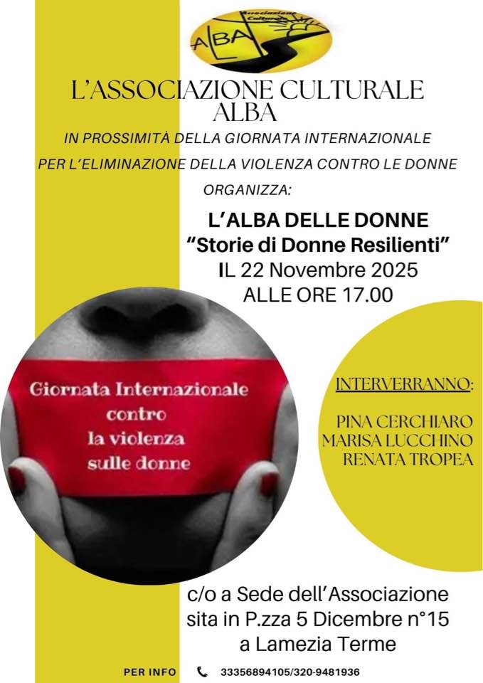 L’Associazione Culturale ALBA invita a partecipare a “L’Alba delle Donne – Storie di Donne Resilienti”, un incontro speciale in occasione della Giornata Internazionale per l’Eliminazione della Violenza contro le Donne.