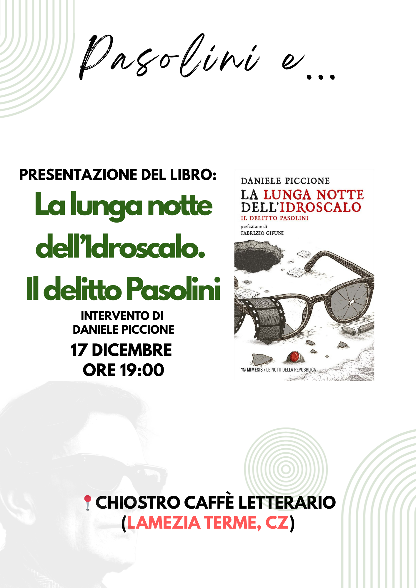 L'evento rientra nella rassegna "Pasolini e..." ed è la presentazione del libro-inchiesta "La lunga notte dell'Idroscalo. Il delitto Pasolini" con l'intervento dell'autore Daniele Piccione, consigliere parlamentare e saggista.