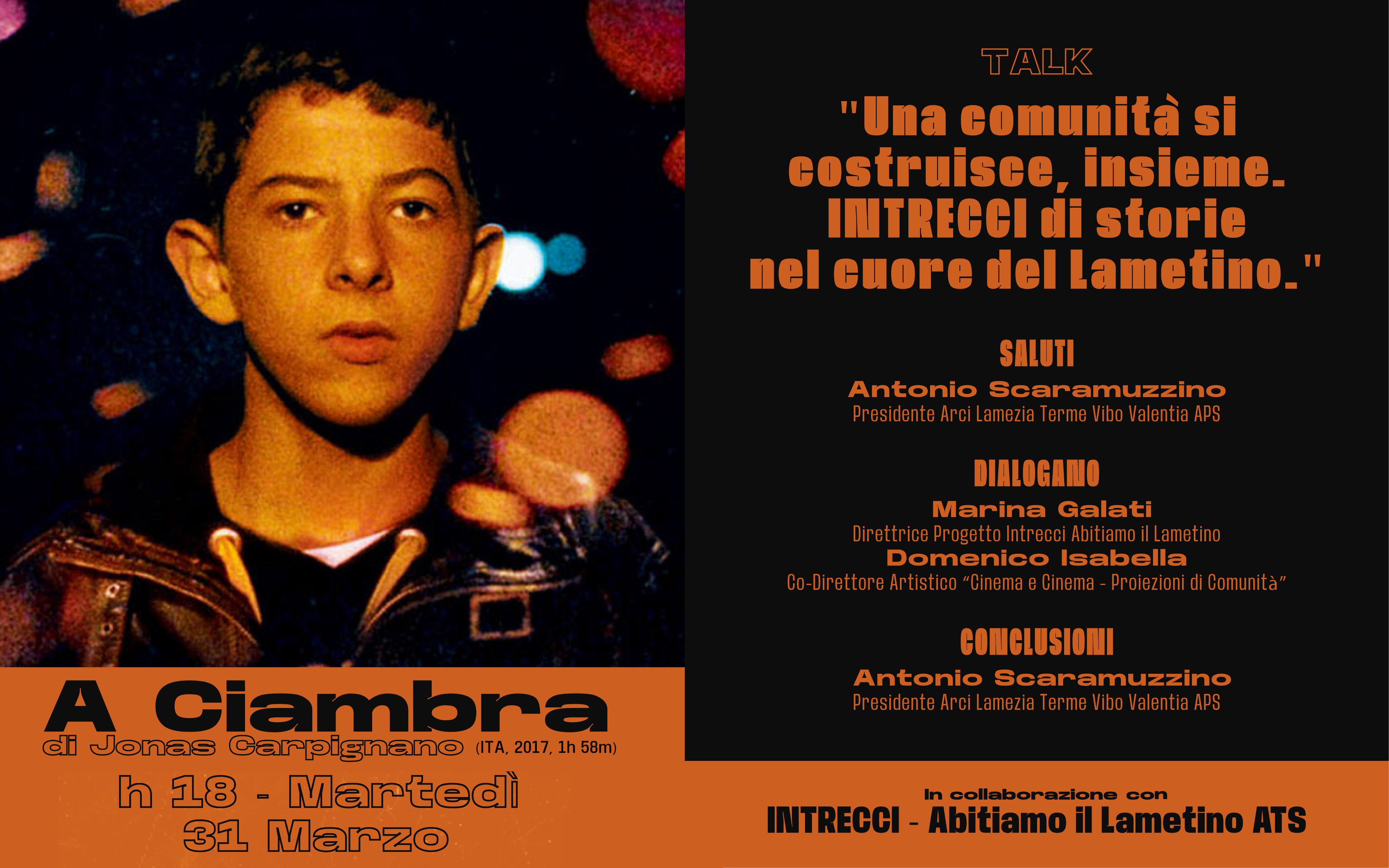 La proiezione sarà preceduta dal talk “Una comunità si costruisce, insieme. INTRECCI di storie nel cuore del Lametino” con Antonio Scaramuzzino, Presidente di Arci Lamezia Terme Vibo Valentia APS e Marina Galati, Direttrice del Progetto Intrecci - Abitiamo il Lametino, che dialogherà con il Co-Direttore Artistico della rassegna cinematografica Domenico Isabella.