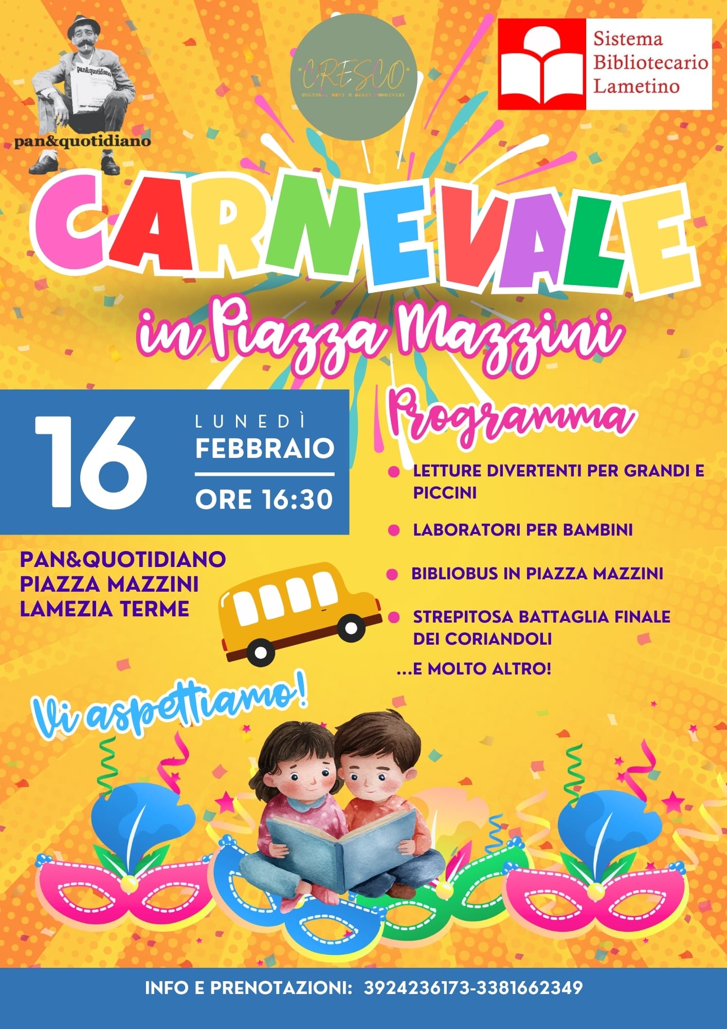 Un pomeriggio di festa e condivisione che prevede letture divertenti per grandi e piccini, laboratori per bambini e la presenza del Bibliobus in piazza. La giornata si concluderà con una "strepitosa battaglia finale dei coriandoli". L'evento è organizzato nell'ambito del progetto CRESCO in collaborazione con il Sistema Bibliotecario Lametino.
