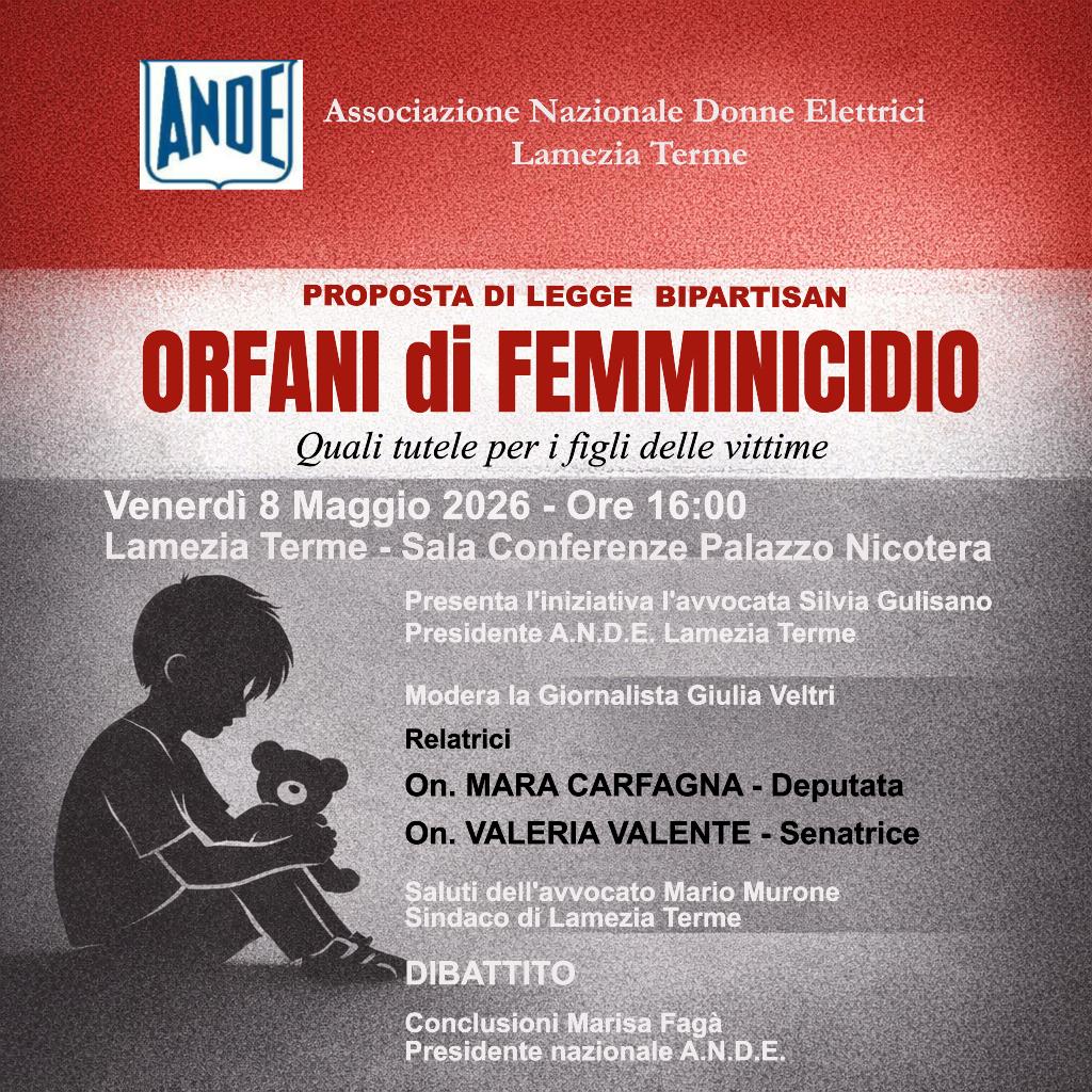 Convegno in oggetto organizzato dall' A.N.D.E. Lamezia Terme avente a oggetto la proposta di legge bipartisan sugli orfani di femminicidio che si terrà in data 8 maggio 2026 presso la sala conferenze di Palazzo Nicotera.