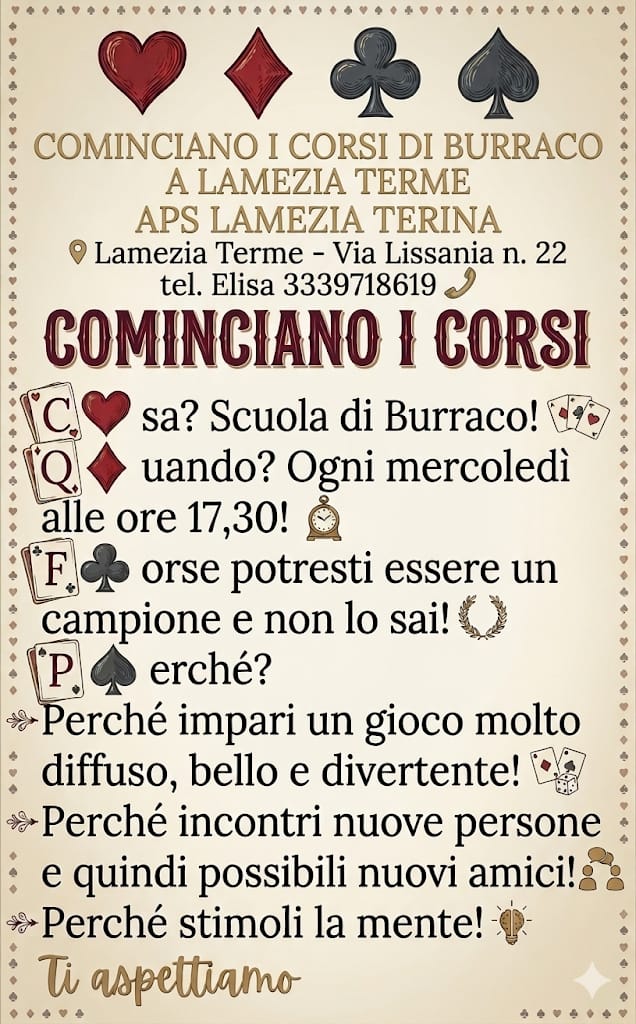 > I corsi di Burraco, a titolo completamente gratuito, si terranno ogni mercoledì alle ore 17,30 in via Lissania 22, presso l'APS Terina Lamezia Terme.