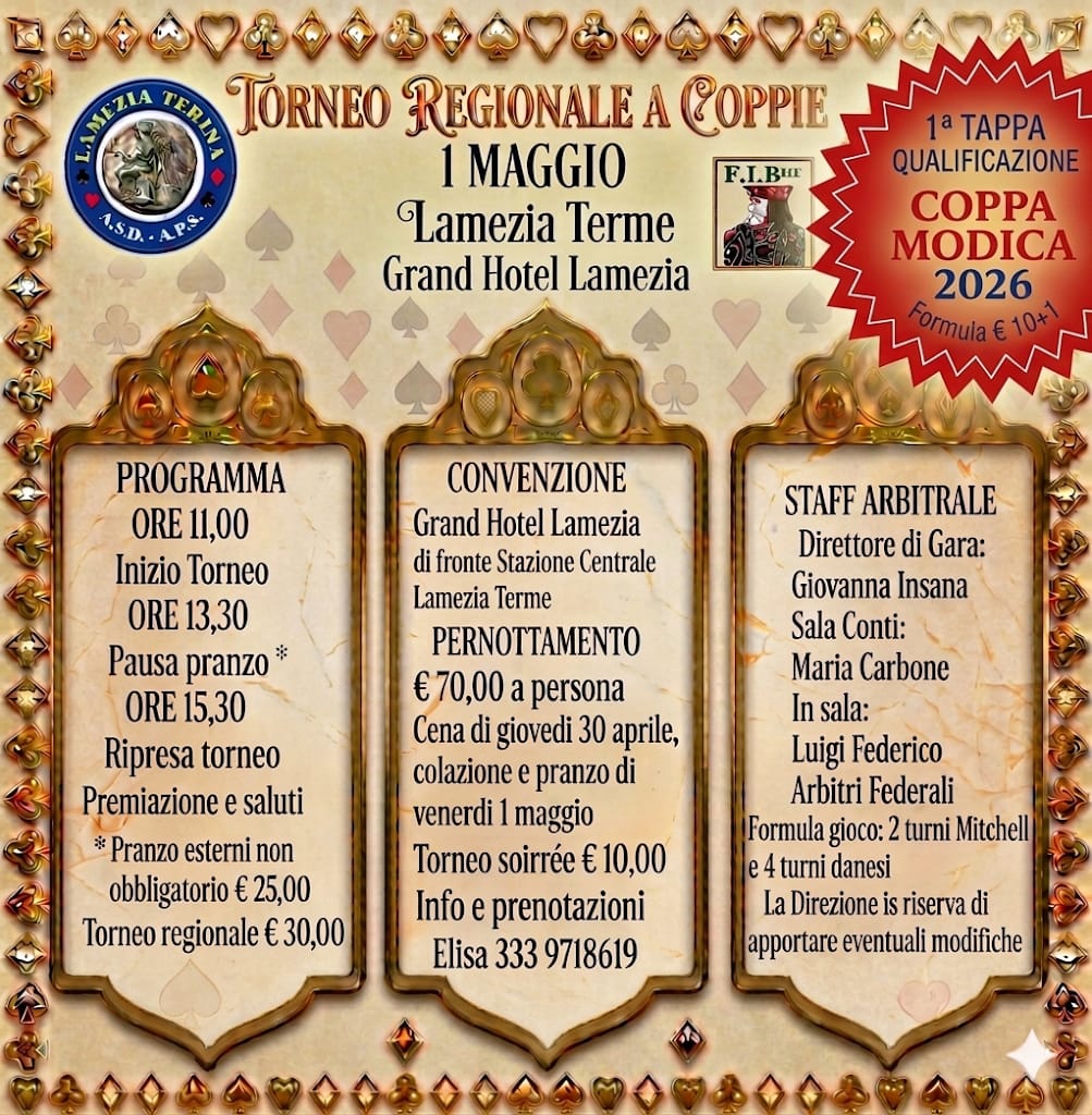 Il Torneo Regionale di Burraco del 1 maggio si terrà presso il Grand Hotel Lamezia.