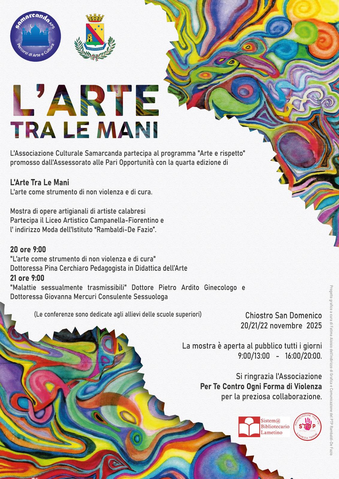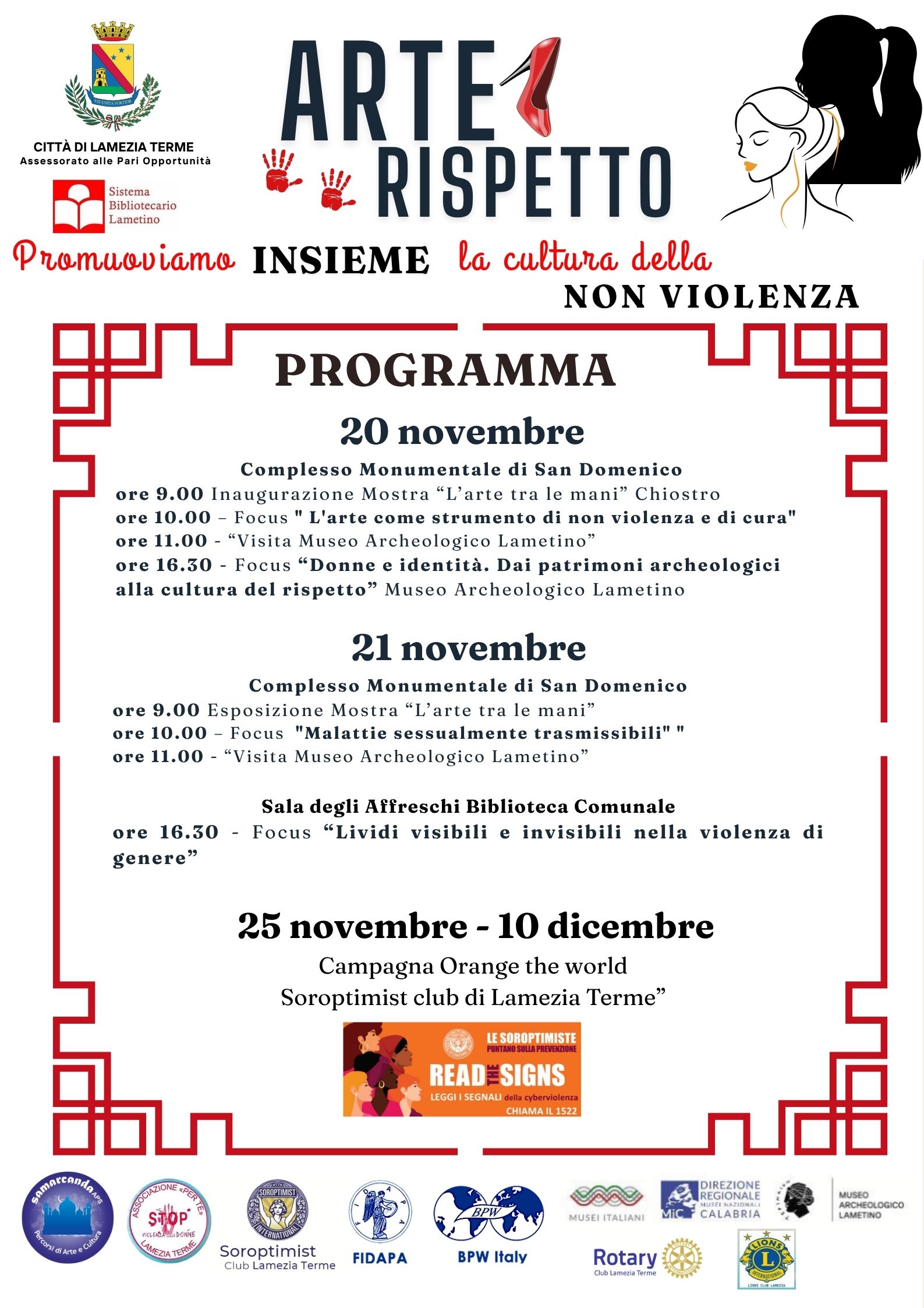 Le attività si svolgeranno dal 20 novembre al 10 dicembre e vedranno la sinergia di importanti realtà locali come l’Associazione Samarcanda, Fidapa, Associazione Donne Medico, Soroptimist Club Lamezia Terme, Per Te, Rotary Club e Lions Club, oltre al Museo Archeologico Lametino e al Sistema Bibliotecario Lametino.