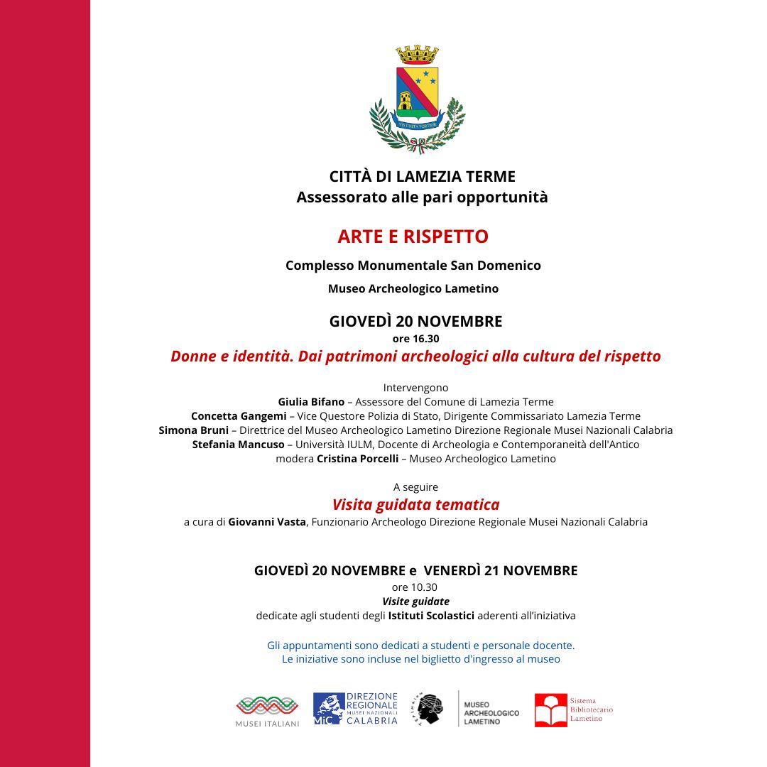 ·ore 16:30 – Incontro: “Donne e identità. Dai patrimoni archeologici alla cultura del rispetto” (Museo Archeologico Lametino). Intervengono: Giulia Bifano (Assessore), Concetta Gangemi (Vice Questore Polizia di Stato), Simona Bruni (Direttrice del Museo), Stefania Mancuso (Università IULM, archeologa). Modera la Dr.ssa Cristina Porcelli.